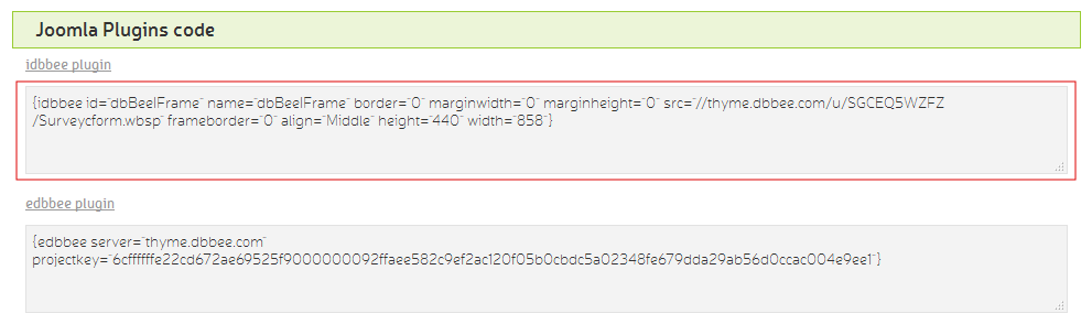 Therefore, in order to connect your dbBee project with your Joomla! site you should use "shortcodes” idbbee or edbbee for embedding dbBee projects to your Joomla page or post as iframe or script element, and for that you need to install dbBee extensions for Joomla - either idbbee or edbbee (or both).